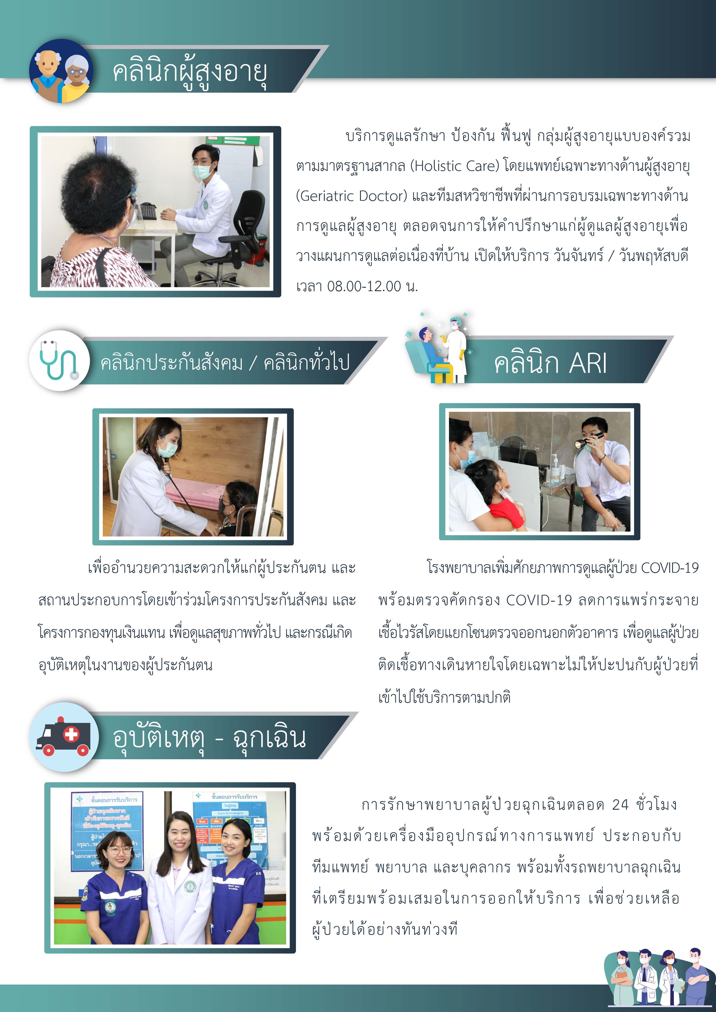 การให้บริการผู้ป่วยนอก ตารางการให้บริการผู้ป่วยนอก(แยกตามคลินิก) การให้บริการผู้ป่วยใน การให้บริการการแพทย์ฉุกเฉิน การให้บริการผู้ป่วยในชุมชน ห้องสมุด