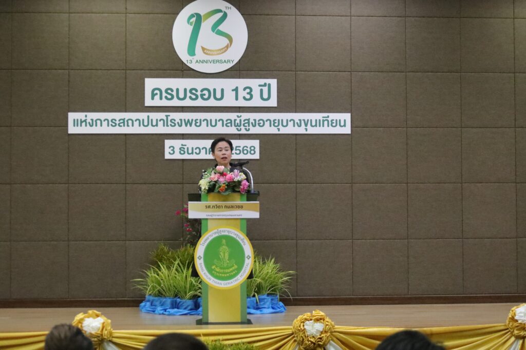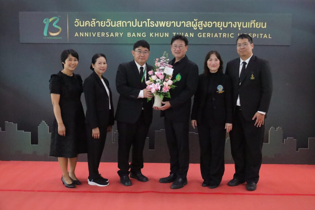 นางสาวณัฐนรี โชควิริยากร รองผู้อำนวยการโรงพยาบาล ฝ่ายการแพทย์ มอบช่อดอกไม้แสดงความยินดี ในงานวันสถาปนาครบรอบ 13 ปี แห่งการสถาปนาโรงพยาบาลผู้สูงอายุบางขุนเทียน