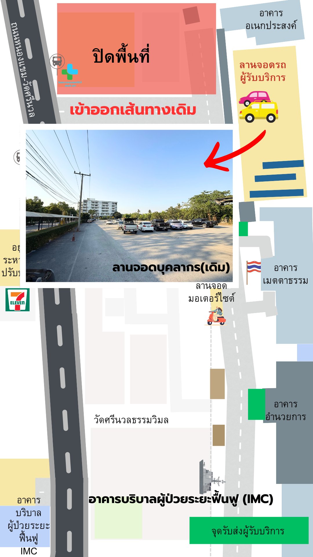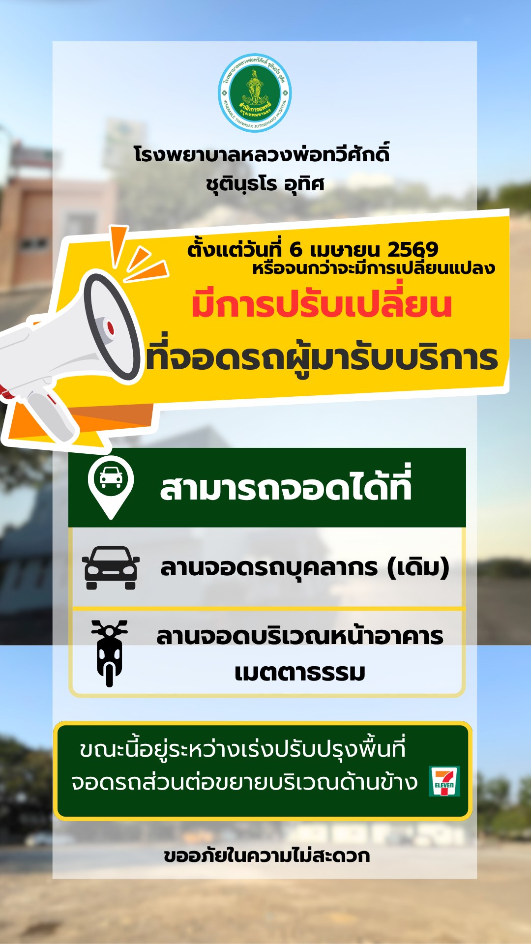 ประกาศ แจ้งการปรับเปลี่ยนที่จอดรถผู้มารับบริการ ตั้งแต่วันที่ 6 เมษายน 2569 ผู้มารับบริการสามารถจอดได้ที่ลานจอดรถบุคลากร(เดิม) ส่วนรถจักรยานยนต์ สามารถจอดได้ที่ลานจอดรถบริเวณหน้าอาคารเมตตาธรรม และในขณะนี้ท่านยังคงสามารถใช้ทางเข้า-ออกได้ตามปกติ ขออภัยในความไม่สะดวกมา ณ ที่นี้