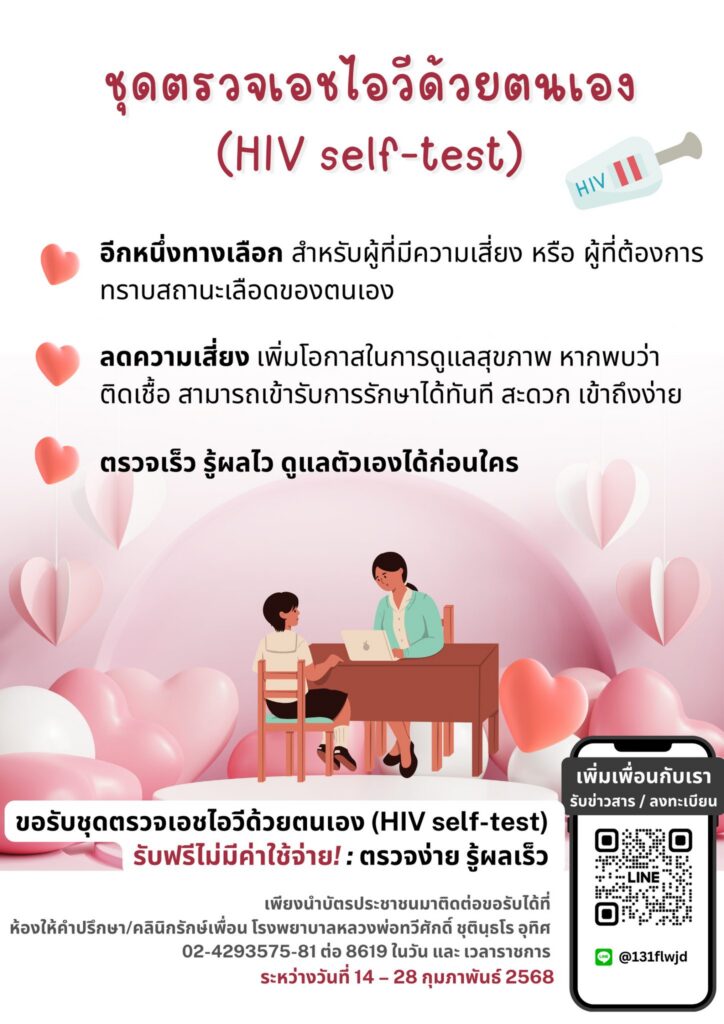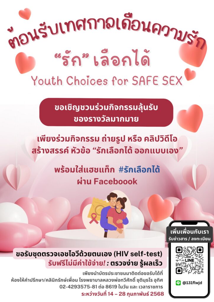 ต้อนรับเทศกาลเดือนแห่งความรัก “รัก” เลือกได้ : Youth Choices for SAFE SEX แนวคิดการรณรงค์ป้องกันโรคติดต่อทางทางเพศสัมพันธ์ โรงพยาบาลหลวงพ่อทวีศักดิ์ ชุตินธโร อุทิศ โดยคลินิกรักษ์เพื่อนและห้องให้คำปรึกษา ขอเชิญชวนผู้สนใจร่วมกิจกรรมรณรงค์ฯ เพียงถ่ายรูป หรือคลิปวิดีโอสร้างสรรค์ หัวข้อ “รักเลือกได้ ออกแบบเอง” พร้อมใส่แฮชแท็ก #รักเลือกได้ ลุ้นรับรางวัลชุดตรวจเอชไอวีด้วยตนเอง (HIV self-test ) ฟรีไม่มีค่าใช้จ่าย