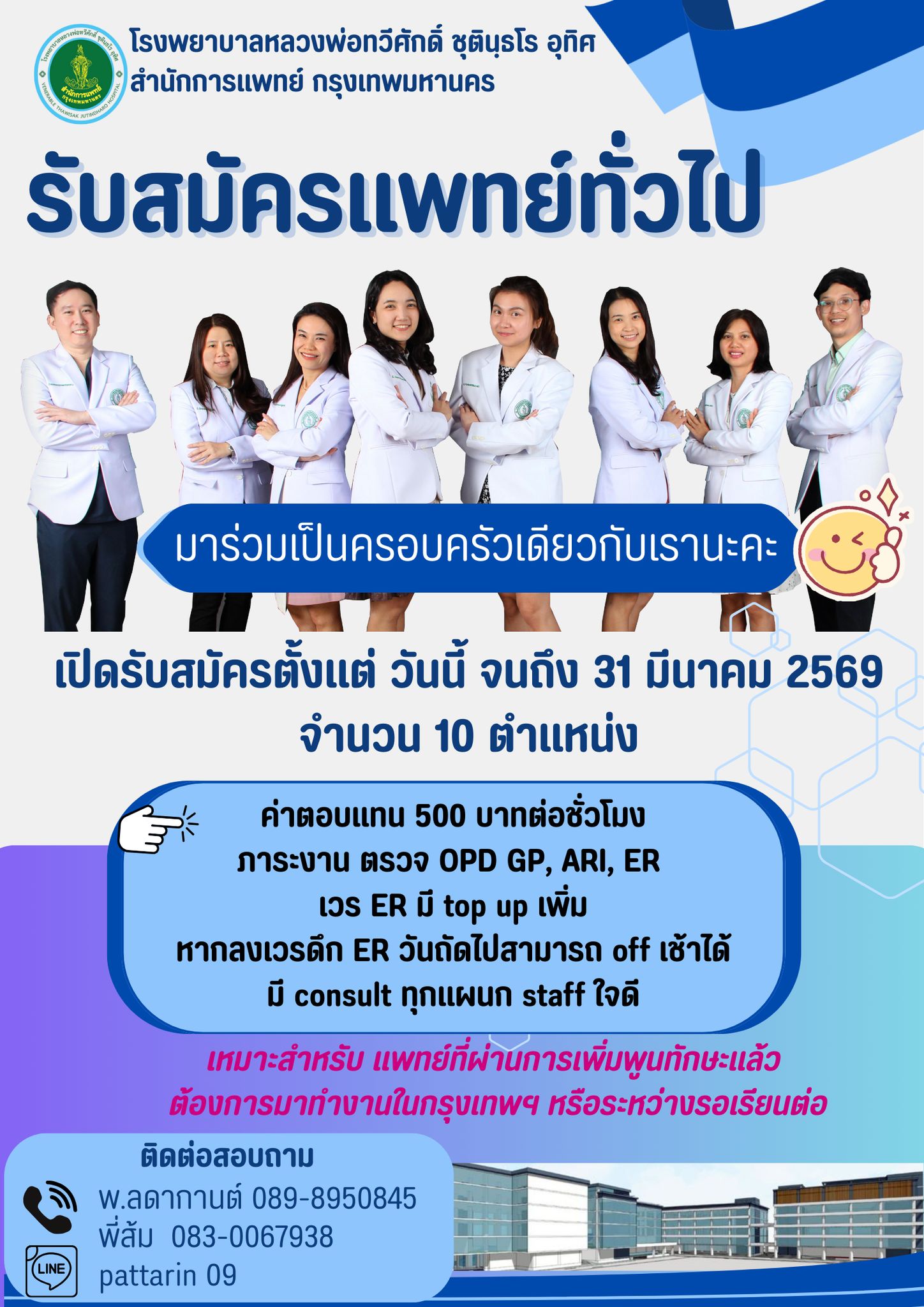 เหมาะสำหรับ แพทย์ที่ผ่านการเพิ่มพูนทักษะแล้ว ต้องการมาทำงานในกรุงเทพฯ หรือระหว่างรอเรียนต่อ